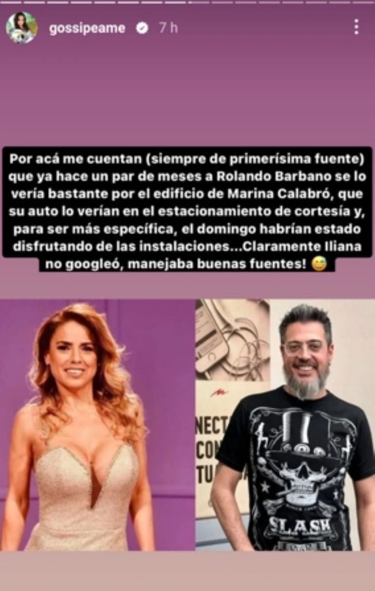 "Por acá me cuentan, siempre de primerísima fuente, que ya hace un par de meses a Rolando Barbano se lo vería bastante por el edificio de Marina Calabró", expresó la panelista en sus redes sociales, confirmando el romance.
