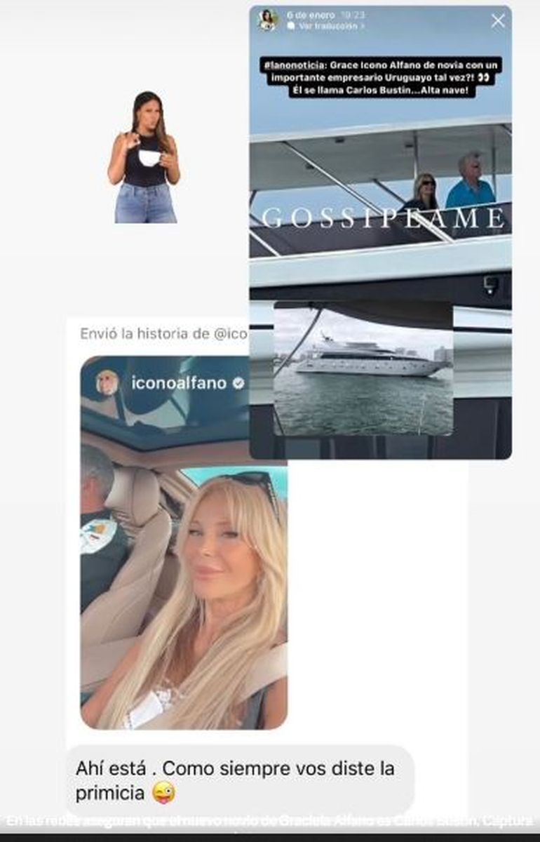 Además, sobre esa imagen, la especialista en chimentos informó: "¡¿Grace Icono Alfano de novia con un importante empresario uruguayo tal vez?! Él se llama Carlos Bustin... ¡Alta nave!".
