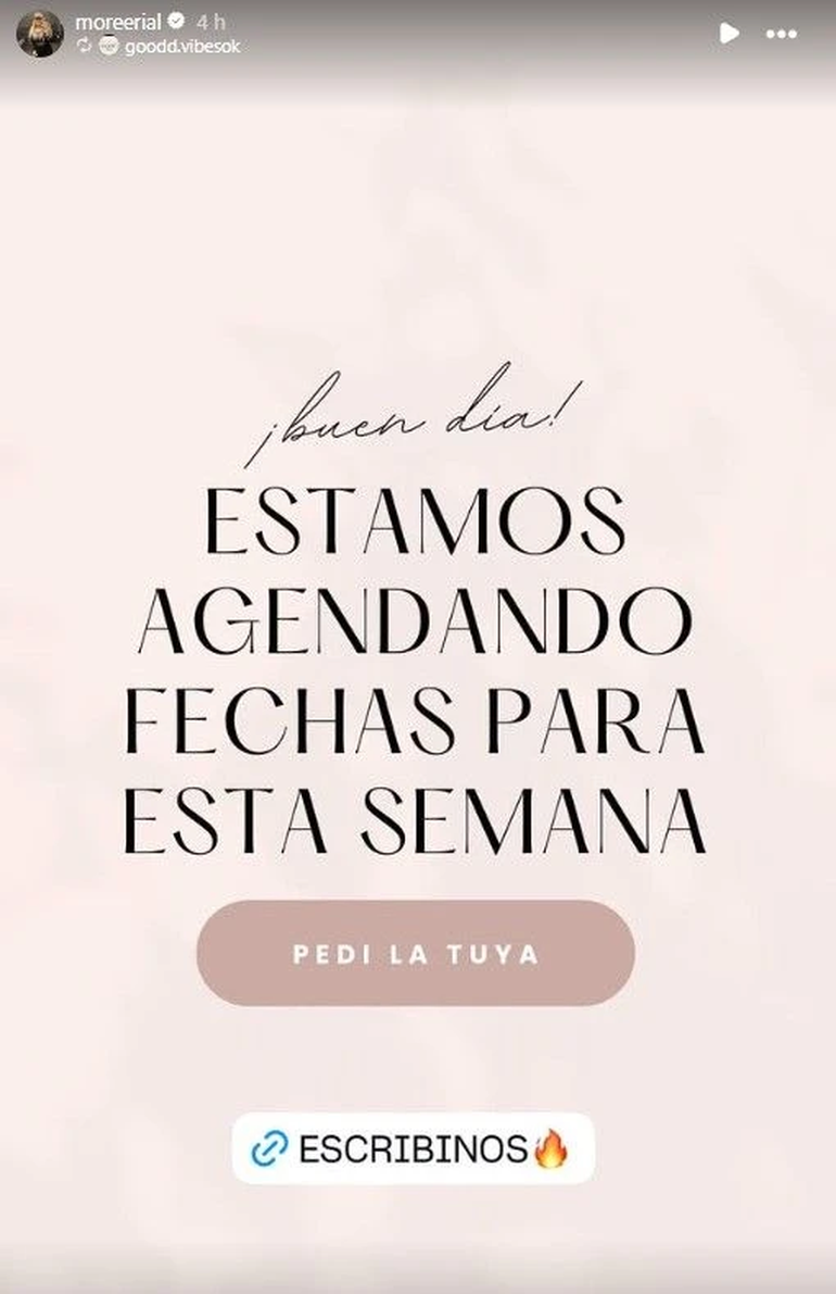 “Estamos agendando fechas para esta semana, pedí la tuya”, escribió Morena Rial en una historia de Instagram. Siguiendo al link que compartió la hija de Jorge Rial, se llega a una plataforma que publicita a diferentes influencers y con distintas convocatorias, dependiendo el caso.