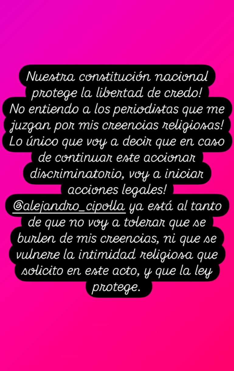 Al comienzo de esta explicación, la joven se amparó: "Nuestra Constitución Nacional protege la libertad de credo". Y luego, apuntó al conductor y las "angelitas": "No entiendo a los periodistas que me juzgan por mis creencias religiosas, lo único que voy a decir es que, en caso de continuar este accionar discriminatorio, voy a iniciar acciones legales".