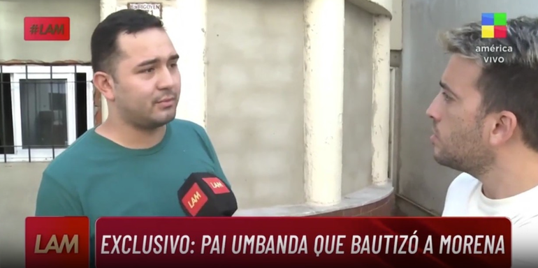Con un móvil desde ese sitio, al que el cronista Santiago Riva Roy definió como un "templo umbanda", hablaron con el pai sobre este "bautismo". "El tema que genera polémica es que hayan puesto un chivo sobre la mesa y lo hayan sacrificado", describió el periodista en el comienzo del informe. Luego, en diálogo con el pai, llamado Gilliard de Ogum, él reveló que Morena llegó a él través de "un conocido" en común.