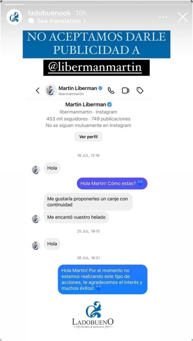 Junto a esto, adjuntaron las pruebas del chat en cuestión con Martín Liberman. "Me gustaría proponerles un canje con continuidad, me encantó vuestro helado", escribió el periodista, "Hola, Martín. Por el momento no estamos realizando este tipo de acciones, te agradecemos el interés y muchos éxitos", le respondieron.