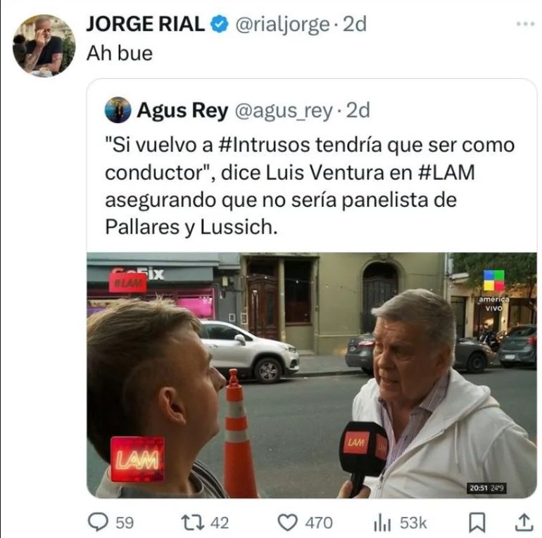 Tras escuchar que Luis Ventura sólo quiere ser el conductor de Intrusos, Jorge Rial no pudo evitar comentar al respecto. Es por eso que compartió un tuit con estas declaraciones y agregó sumándole picante a la relación: “Ah bue”.