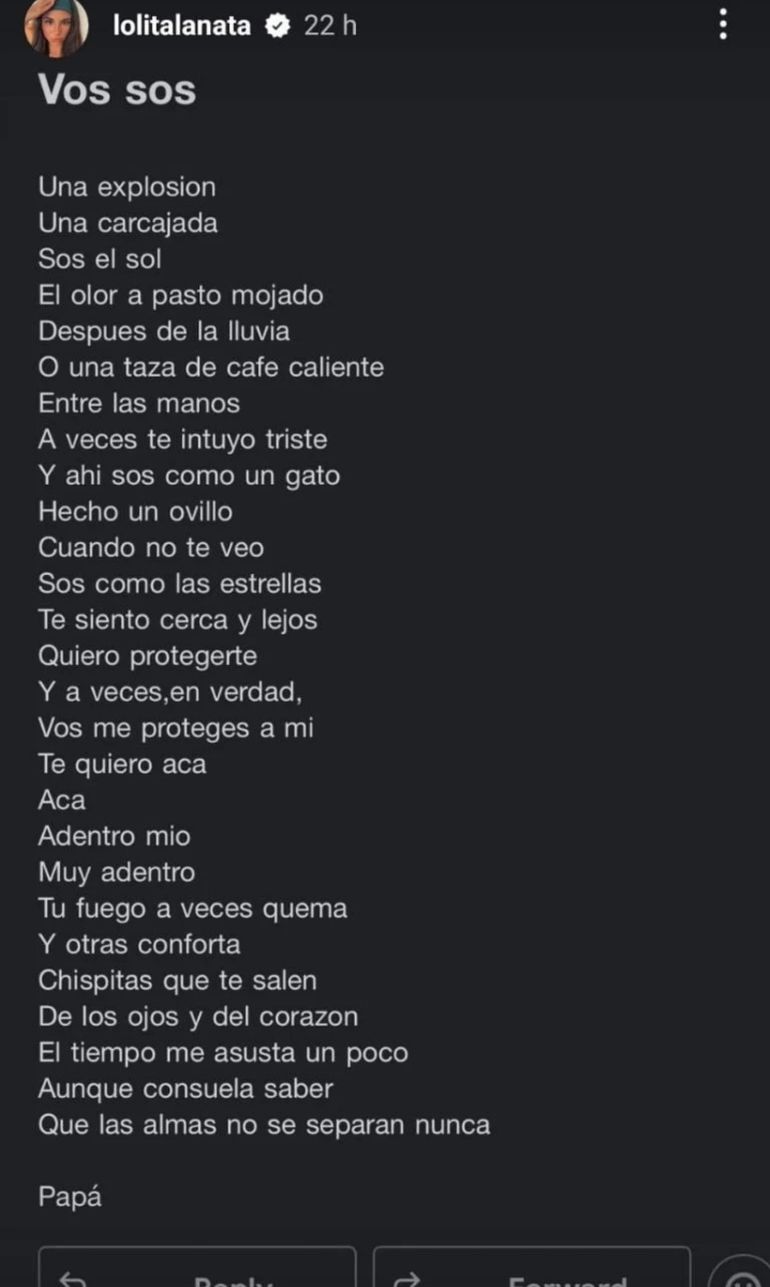 El pasado 30 de mayo, en sus historias de Instagram, Lola publicó el texto titulado “Sos vos”, un mensaje íntimo y cargado de amor que Lanata le había enviado por correo electrónico. Allí, el periodista mostraba una faceta poco conocida, alejada del carácter combativo con el que se lo identificaba en la esfera pública: la de un padre sensible, tierno y profundamente conectado con su hija.