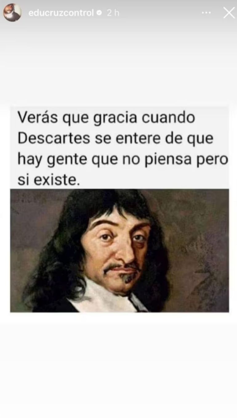 En medio de las repercusiones, Eduardo Cruz, pareja de Eva desde hace seis años y padre de su hijo Cairo, reaccionó en sus redes sociales con una publicación enigmática. "Verás qué gracia cuando Descartes se entere de que hay gente que no piensa, pero sí existe", escribió, acompañado de una imagen del filósofo René Descartes. Este mensaje, que no mencionaba directamente los rumores, no tardó en interpretarse como una respuesta indirecta a las especulaciones.