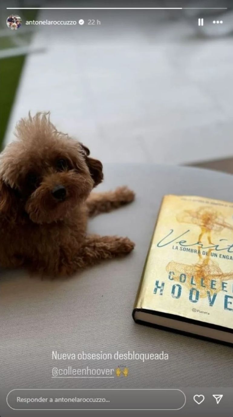 En esta ocasión, Antonela compartió en Instagram un detalle que despertó el interés de sus seguidores: una foto de su perro acompañada por una mesa en la que se encontraba el libro "Verity: la sombra de un engaño" de Colleen Hoover. La empresaria y madre de tres hijos, Thiago, Mateo y Ciro, acompañó la imagen con el comentario “Nueva obsesión desbloqueada”, lo que rápidamente llamó la atención de sus fans.