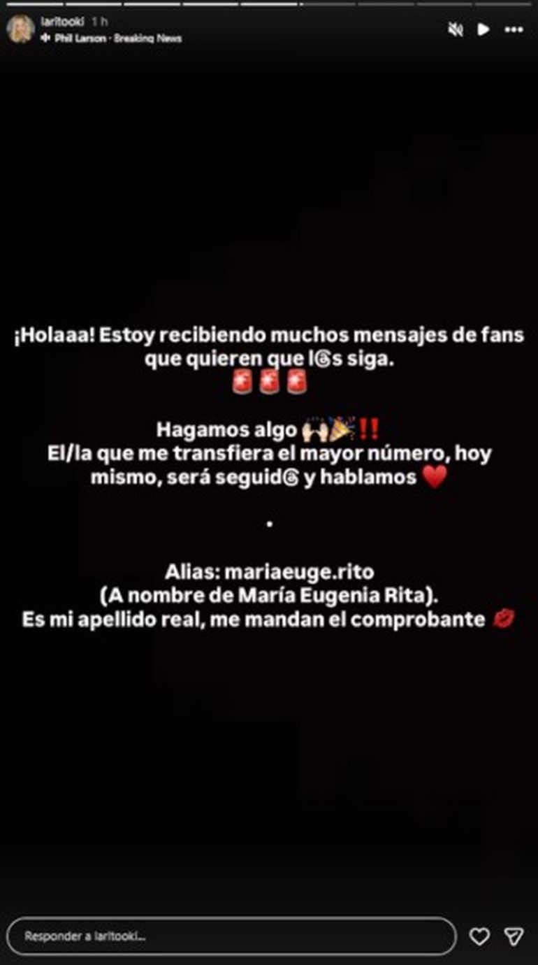 Acto seguido, Ritó pegó su alias y lo habilitó para recibir distintas transferencias para los usuarios que querían ser seguidos por ella misma. “A nombre de María Eugenia Rita. Es mi apellido real, me mandan el comprobante”, exigió en las redes sociales.