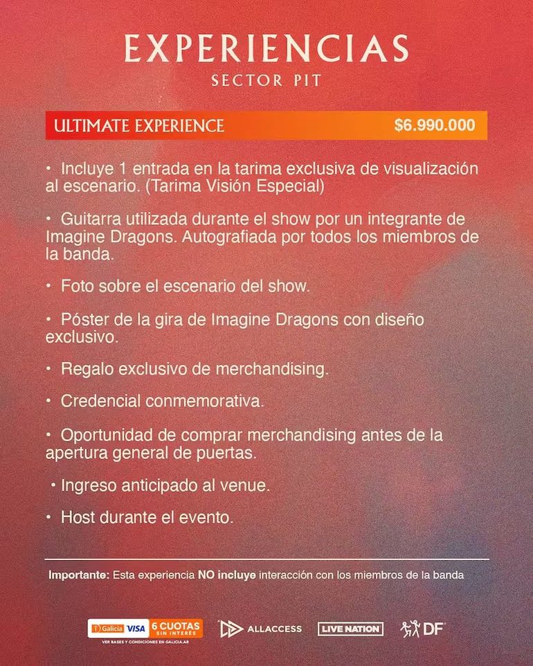 También se encuentran tres tipos de experiencias vip, con el paquete más exclusivo a un precio de casi 7 millones de pesos. El paquete más exclusivo es el Ultimate Experience, con un valor de $6.990.000. Este ticket no solo otorga acceso a una tarima de visión especial cercana al escenario, sino que también incluye una guitarra utilizada durante el show por un integrante de Imagine Dragons, autografiada por todos los miembros de la banda.