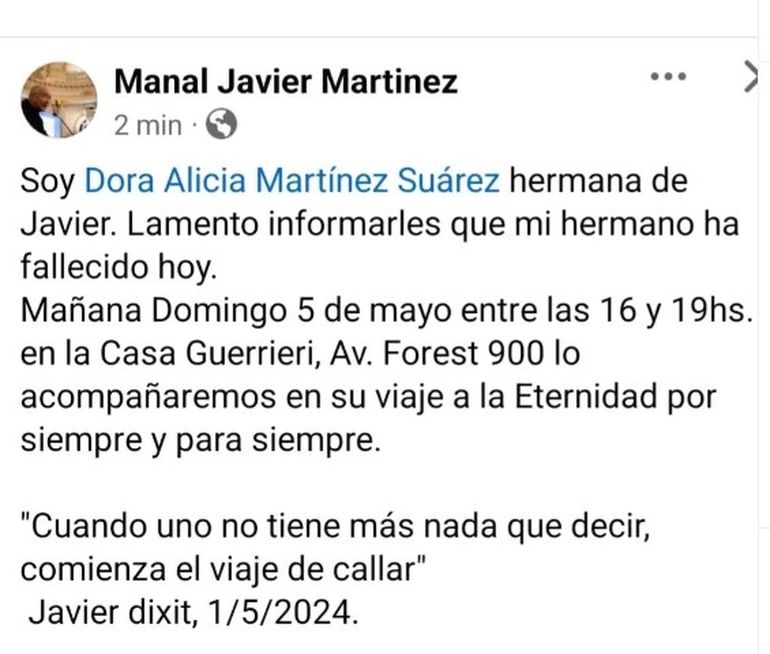 E indicó que despedirán sus restos “el domingo 5 de mayo, entre las 16 y 19, en la Casa Guerrieri de avenida Forest 900 lo acompañaremos en su viaje a la Eternidad por siempre y para siempre”. Y para finalizar, escribió: “Cuando uno no tiene más nada que decir, comienza el viaje de callar”.