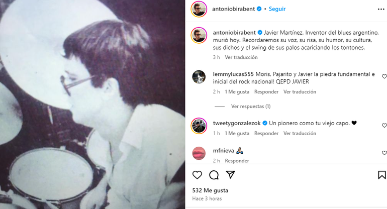 El periodista Sergio Marchi especializado en rock nacional y biógrafo de Charly García, Pappo, Luis Alberto Spinetta y Gustavo Cerati posteó: “Murió el gran Javier Martínez a los 78 años. Sus canciones le dieron vida a Manal y al blues en castellano. Mucha gloria para él, baterista intelectual de la cruz del sur”.
