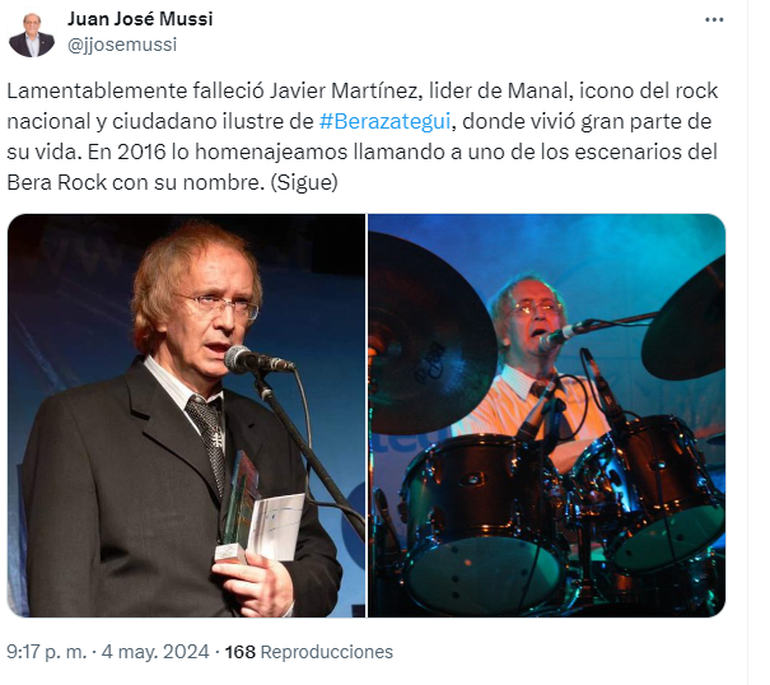 Hasta el intendente de Berazategui, Juan josé Mussi, dejó un mensaje en su cuenta de X (exTwitter). "Lamentablemente falleció Javier Martínez, lider de Manal, icono del rock nacional y ciudadano ilustre de #Berazategui, donde vivió gran parte de su vida. En 2016 lo homenajeamos llamando a uno de los escenarios del Bera Rock con su nombre", lo recordó.