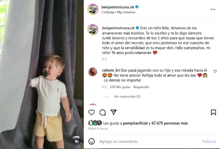 En el posteo no aparece ni es mencionada la China, a pesar de que en las imágenes aparecen fotos familiares de cuando el actor chileno todavía estaba en pareja con la actriz. Sí Vicuña dejó en claro en el video el profundo amor que siente por su hijo. “Eres un niño feliz, Amancio de los amaneceres más bonitos. Te lo escribo y te lo digo siempre”, comienza diciendo el mensaje.