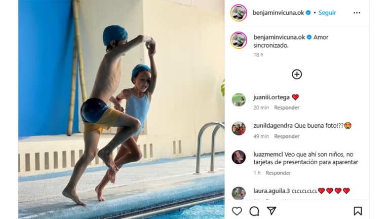 “Amor sincronizado”, dice la descripción de la foto que Vicuña compartió para sus millones de seguidores. En la postal se la podía ver a Magnolia, la nena que tuvo con la actriz, mientras jugaba en la pileta con uno de sus hermanitos, fruto de la relación del actor con Pampita.