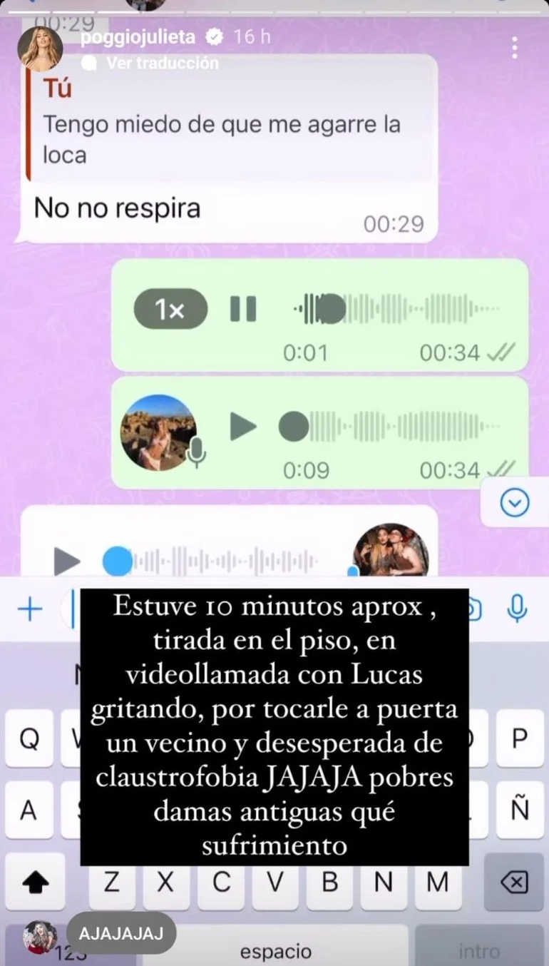 En sus historias explicó a sus seguidores: “Estuve aproximadamente diez minutos tirada en el piso, en videollamada con Lucas gritando, por tocarle la puerta a un vecino y desesperada de claustrofobia”. “Pobres damas antiguas, qué sufrimiento!!”, expresó entre risas.