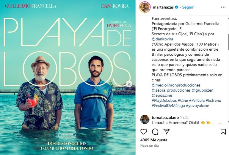 Próximamente los cines será testigo de la película "Playa de Lobos" filmada en la Isla Fuenteventura que tiene como eje principal de la historia "el encuentro improbable entre dos tipos incompatibles. Uno que pasa por la vida sin hacerse cargo de nada, y con esa actitud irritante del: ‘esto no es cosa mía’… ‘a mí me dicen que es así y punto’… ‘hable usted con el responsable’… Y el otro que es alguien al que esa falta de responsabilidad es lo que más lo irrita en la vida hasta límites peligrosos”.