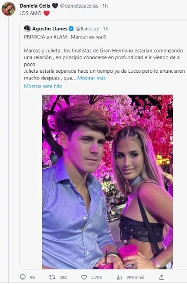 Por su parte, la encargada de darle aún más veracidad al relato fue Daniela Celis, una de las mejores amigas de Julieta Poggio. Es que en su cuenta de Twitter ella citó la información y agregó “LOS AMO”, para confirmar la relación y expresar sus sensaciones.