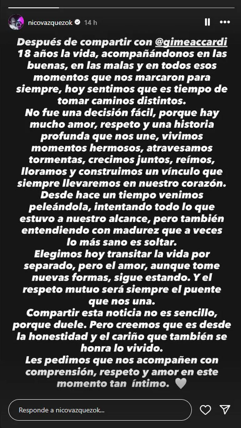 "Después de compartir con @gimeaccardi 18 años la vida, acompañándonos en las buenas, en las malas y en todos esos momentos que nos marcaron para siempre, hoy sentimos que es tiempo de tomar caminos distintos", dijo Nico Vázquez en un posteo que Gimena Accardi también subió a sus historias de Instagram.