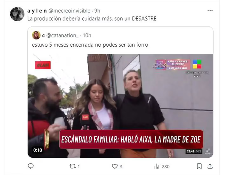 “Estuvo 5 meses encerrada, no podés ser tan forr...”, lanzó una internauta en su perfil de Twitter. Es que a la participante le consultaron sobre la pelea de su novio con su mamá, algo que ella desconoce por su aislamiento. “Nefastos, juegan con la salud mental”, indicó otro. “Pobre Zoe”, cuestionaron también.