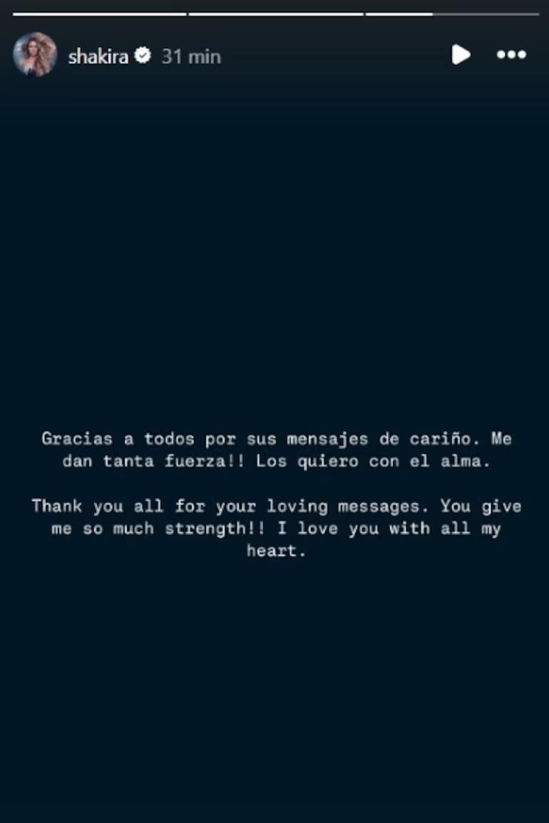 Posteriormente, por las redes sociales, la colombiana publicó un posteo en el que dio las gracias a su fandom. "Gracias a todos por sus mensajes de cariño. Me dan tanta fuerza. Los quiero con alma", sostuvo Shakira.