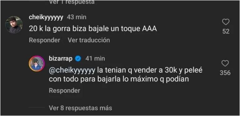 La publciación se llenó de comentarios emocionados por la posibilidad de comprar la gorra de su ídolo. Desde artistas consagrados como Fer Palacios quien escribió: “¡Qué feje!”, hasta algunas modelo como Stephie Denver quien aseguró ya tener la suya. Incluso escribió Hugo Basilota, el dueño de la fábrica de los alfajores Guaymallen que es famoso en twitter y que comparte con Bizarrap la pasión por Vélez: “Mándame una Biza, ¡¡Fortinero querido!! Te mando 5 cajas de ORO”.