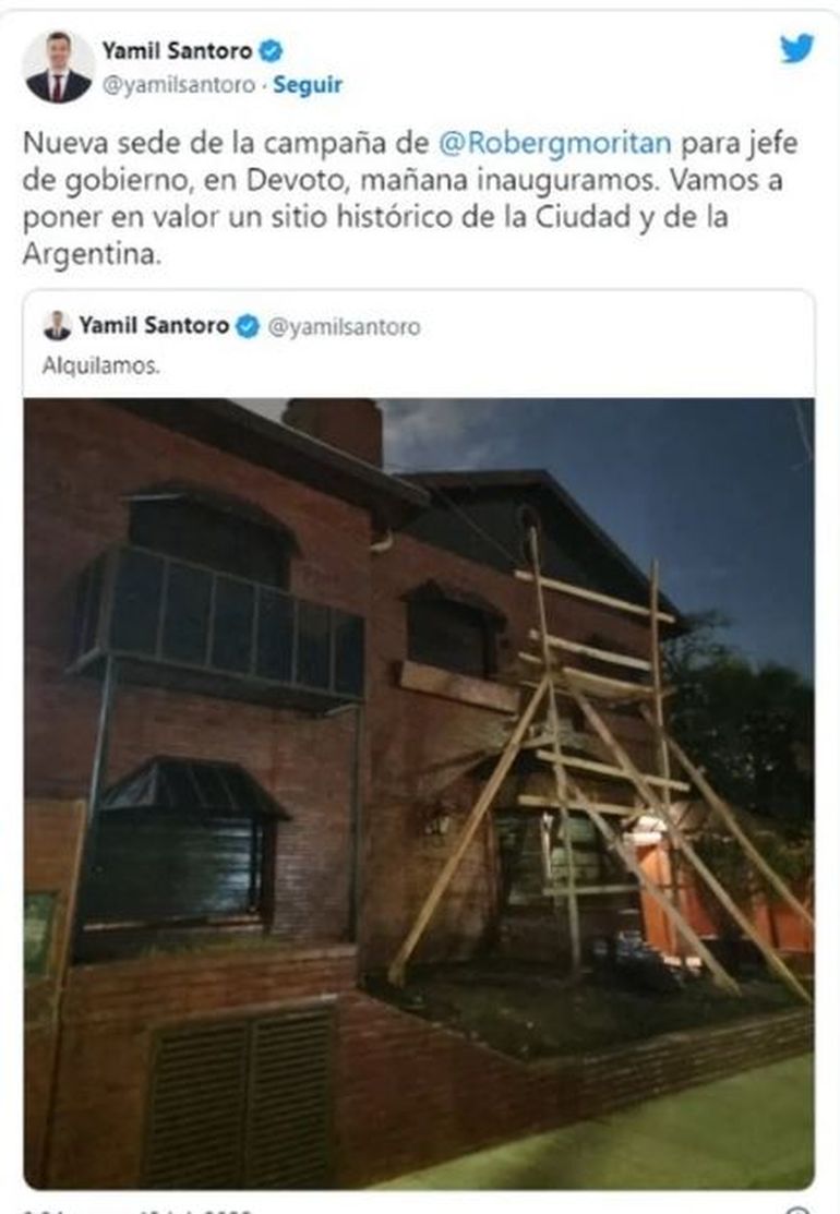 Fue Yamil Santoro, jefe de campaña de García Moritán quien confirmó la noticia a través de sus redes sociales en su momento: "Nueva sede de la campaña de Roberto García Moritán para jefe de Gobierno, en Devoto, mañana inauguramos. Vamos a poner en valor un sitio histórico de la Ciudad y de la Argentina", escribió en Twitter con una foto de la icónica casa.