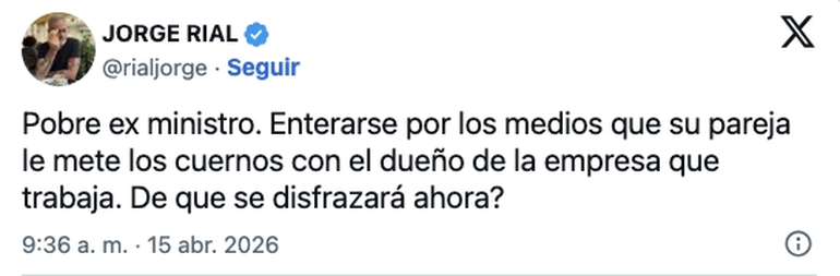“Pobre ex ministro. Enterarse por los medios que su pareja le mete los cuernos con el dueño de la empresa en la que trabaja. ¿De qué se disfrazará ahora?”, expuso el conductor de Argenzuela, sin dar nombres propios. Pero desde el programa el runrún del espectáculo, por Crónica TV, dieron a conocer diferentes detalles. De hecho, afirmaron que “hay fuertes rumores”, y fueron directamente al hueso de esta polémica inesperada.