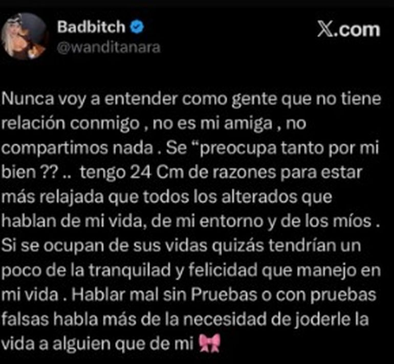 Días atrás, en medio de los rumores sobre una posible crisis sentimental, Wanda Nara sorprendió con un posteo jugado e íntimo en sus redes sociales que no pasó desapercibido. La empresaria y conductora de MasterChef Celebrity utilizó su cuenta de X (ex Twitter) para responder a las versiones que circulaban sobre su relación con Martín Migueles, apuntando con dureza contra quienes opinan sobre su vida privada sin conocerla. En ese descargo, Wanda dejó una frase provocadora vinculada a la intimidad de la pareja que generó una fuerte repercusión entre sus seguidores y que, horas más tarde, decidió eliminar.