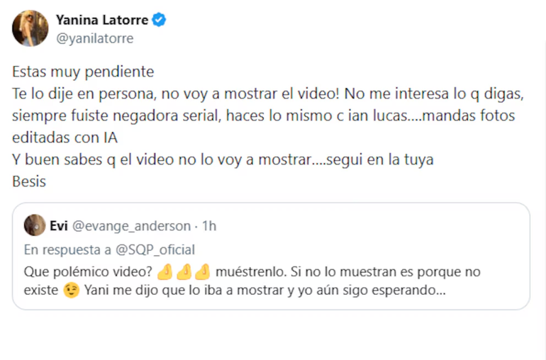 La respuesta de Latorre no se hizo esperar y volvió a subir la temperatura del enfrentamiento. Desde su cuenta oficial, la conductora de SQP reiteró que no piensa difundir el video, aunque sostuvo su relato sobre la existencia del material: “Estas muy pendiente. ¡Te lo dije en persona, no voy a mostrar el video! No me interesa lo que digas, siempre fuiste negadora serial”, disparó, y aprovechó para apuntar al reciente escándalo mediático de Anderson: “Hacés lo mismo con Ian Lucas, mandás fotos editadas con IA”.