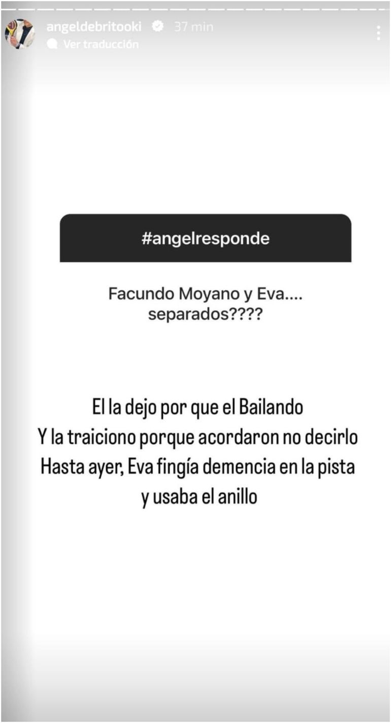 En respuesta a una pregunta de un seguidor que indagaba sobre la separación de Eva y Facundo, Ángel De Brito afirmó: "Él la dejó por el Bailando y la traicionó porque acordaron no decirlo". Estas revelaciones sugieren que la participación de Eva Bargiela en el programa de Marcelo Tinelli podría haber sido un punto de conflicto en la relación, y Facundo Moyano habría tomado la decisión de terminarla.