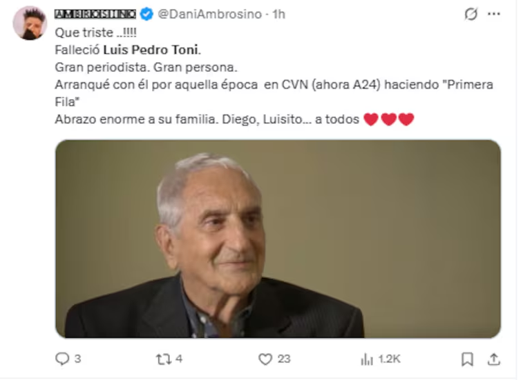 Uno de los primeros en hacerlo fue el periodista Daniel Ambrosino, quien, a través de su cuenta de X, escribió: “¡Qué triste! Falleció Luis Pedro Toni. Gran periodista. Gran persona. Arranqué con él por aquella época en CVN (ahora A24) haciendo Primera Fila. Abrazo enorme a su familia. Diego, Luisito... a todos”. Por su parte, Laura Ubfal, también se sumó a los mensajes de despedida, ya que posteó: “A sus 91 años falleció un gran periodista de espectáculos. Socio de APTRA. Así lo recordamos a Luis Pedro Toni”.
