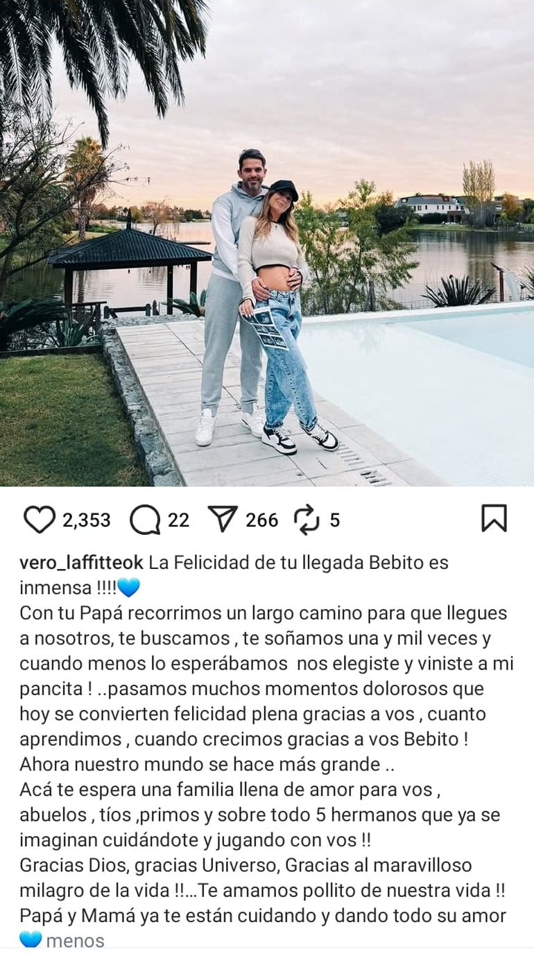 “Te buscamos, te soñamos una y mil veces, y cuando menos lo esperábamos, nos elegiste”, escribió Laffitte, quien ya es madre de dos hijos. La publicación incluyó además palabras de agradecimiento hacia el universo, los afectos que los rodean y, especialmente, hacia la vida por permitirles vivir esta nueva etapa juntos. El bebé será el primer hijo de la pareja y el tercero para Gago, quien ya es padre de dos hijos nacidos de su anterior relación con la extenista Gisela Dulko.