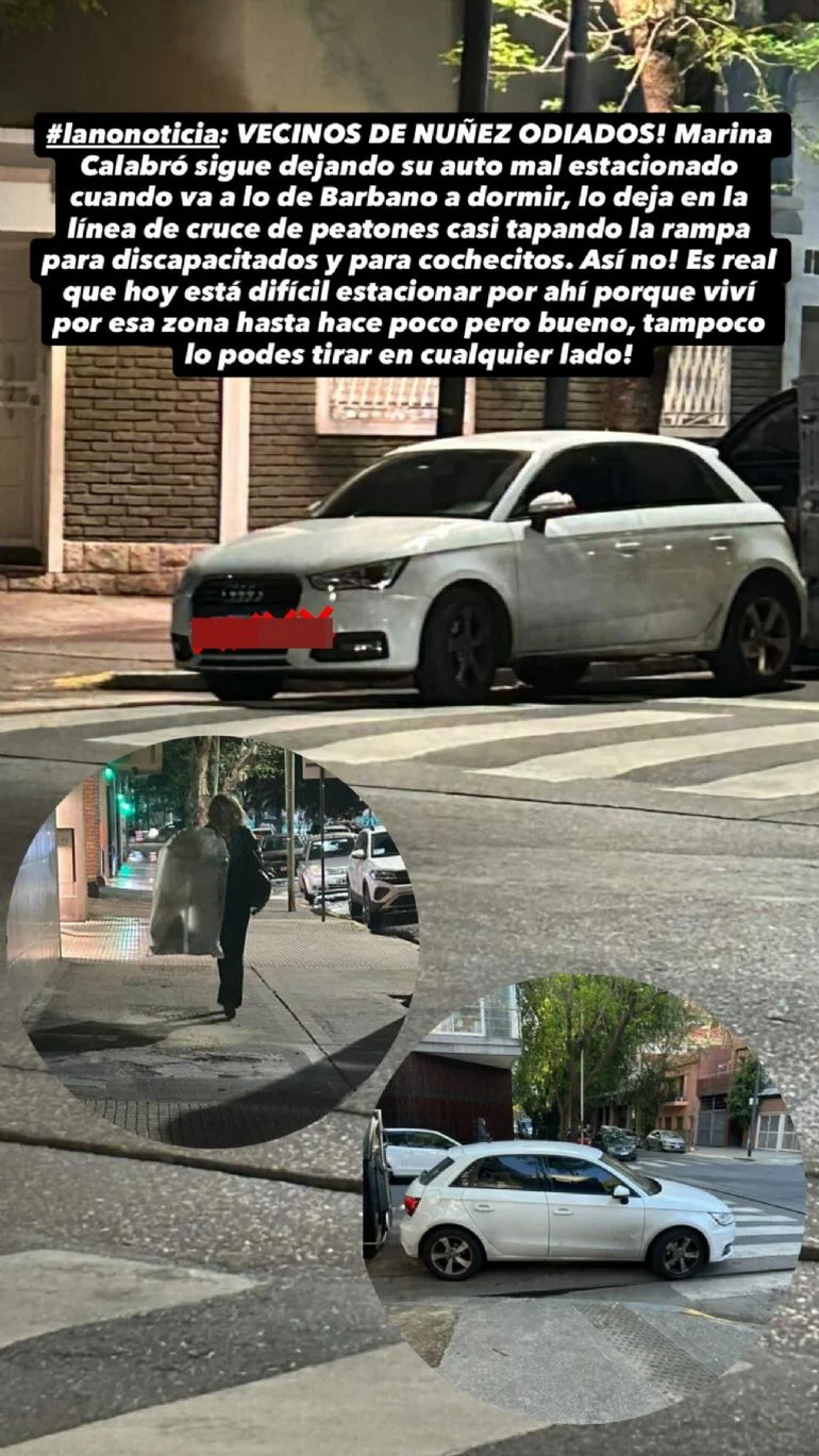 La influencer compartió la foto y sumó un texto sobre la situación vivida. “VECINOS DE NUÑEZ ODIADOS! Marina Calabró sigue dejando su auto mal estacionado cuando va a lo de Barbano a dormir, lo deja en la línea de cruce de peatones casi tapando la rampa para discapacitados y para cochecitos. Así no!. Es real que hoy está difícil estacional por ahí porque como por esa zona hasta hace poco pero bueno, tampoco lo podés tirar en cualquier lado”, escribió la periodista.