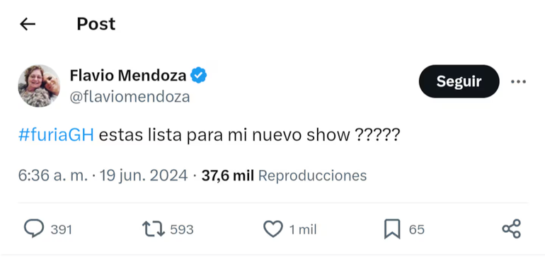 En horas de la madrugada del miércoles, Flavio lanzó un mensaje en sus redes sociales donde dejó asentada la propuesta para Furia: “#FuriaGH estás lista para mi nuevo show????”.