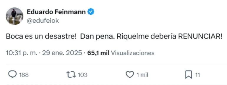 No es la primera vez que el mediático expresa su frustración con la dirigencia de su club preferido en redes sociales. Días atrás, después del 0 a 0 como local frente a Argentinos, Eduardo Feinmann criticó a Boca por su actuación: "¡Qué pobreza Boca! LPMQLP", fue el mensaje que causó división entre sus seguidores, con alguno apoyándolo y otros defendiendo la escuadra de Gago.