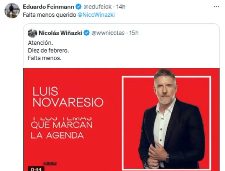 El conductor del nuevo noticiero de A24 celebró su llegada al canal informativo de Grupo América a través de su cuenta de X, donde saludó a algunos de sus nuevos colegas. "Falta menos querido", le prometió Eduardo Feinmann a Nicolás Wiñazki. "Ahí estaremos juntos querido", le escribió también a Pablo Rossi, su excompañero de LN+.