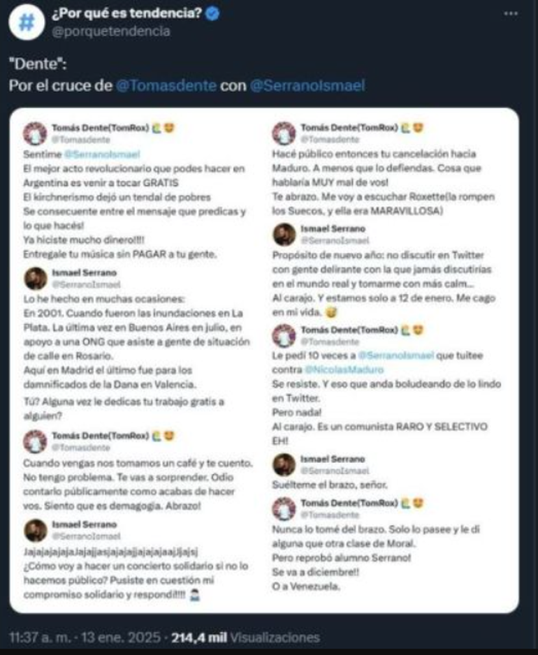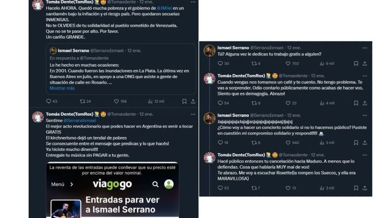 Siguiendo con su respuesta, Ismael preguntó: "Tú? Alguna vez le dedicas tu trabajo gratis a alguien?". "Cuando vengas nos tomamos un café y te cuento. No tengo problema. Te vas a sorprender. Odio contarlo públicamente como acabas de hacer vos. Siento que es demagogia. Abrazo!", sostuvo Tomás. "JjajajajajaJajajjasjajajajjajajajaajJjajsj ¿Cómo voy a hacer un concierto solidario si no lo hacemos público? Pusiste en cuestión mi compromiso solidario y respondí!!!!", sentenció Serrano contundente. "Hacé público entonces tu cancelación hacia Maduro. A menos que lo defiendas. Cosa que hablaría MUY mal de vos! Te abrazo. Me voy a escuchar Roxette (la rompen los Suecos, y ella era MARAVILLOSA)".