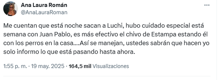 “Hubo cuidado especial esta semana con Juan Pablo, es más efectivo el chivo de Estampa estando él con los perros en la casa”, escribió la periodista Ana Laura Román en su cuenta de X.