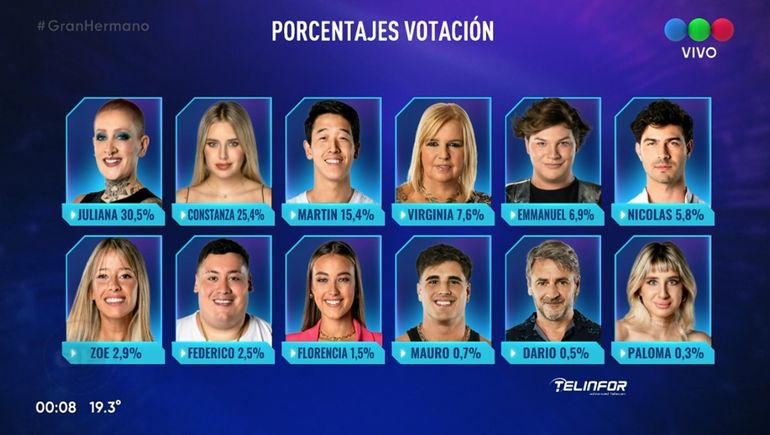 Al mismo tiempo se conoció el ranking de los hermanitos, excepto Bautista que no quedó nominado. Juliana es, sin dudas, la favorita de esta edición y cosechó el 30.5% de los votos positivos, seguida por: Coty con el 25.2%, Martín15.4%, Virginia 7.6%, Emmanuel 6.9%, Nicolás 5.8%, Zoe 2.9%, Federico 2.5%, Florencia 1.5%, Mauro 0.7%, Darío 0.5% y Paloma 0.3%.