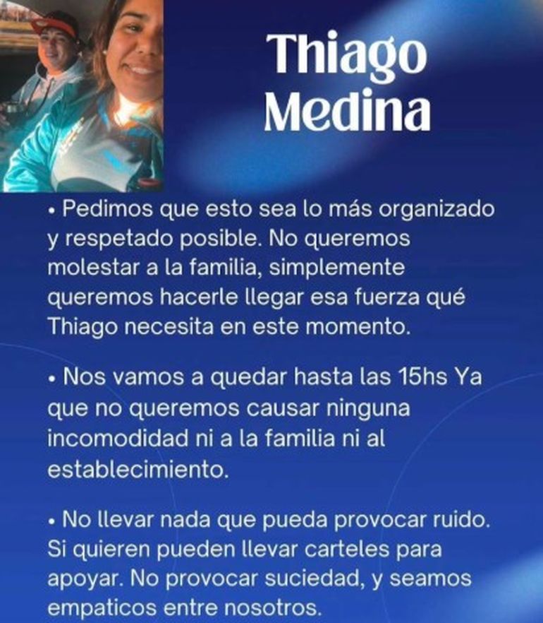 A su vez, la convocatoria hecha por dos hermanas fanáticas de Thiago, sostiene: “Con la ayuda de cada uno de ustedes, lograremos que este gesto sea aun más fuerte. Por eso les pedimos que puedan llevar una vela y así enviar toda la energía, plegaria, oración y amor hacia esa habitación”, indicaron las seguidoras de Thiago.