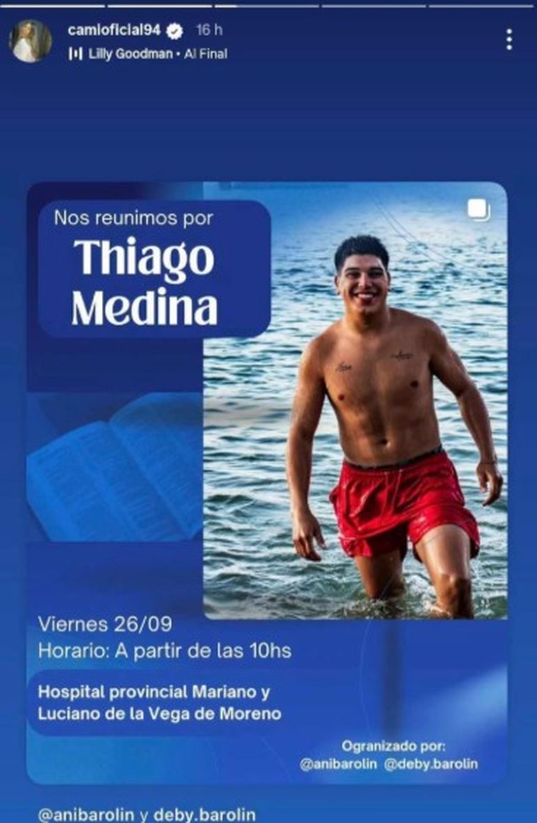 "Cadena de oración. Querida familia, amigos y comunidad: hoy necesitamos de cada uno de ustedes. Thiago se encuentra en un momento muy delicado de salud. Estamos esperando una señal de Dios, una evolución, y creemos en la fuerza de la fe, en los milagros y en la unión de muchas oraciones. Les pedimos que se unan a nosotros, que eleven una plegaria por su vida, por su recuperación", imploró Daniela Celis, la expareja del joven.