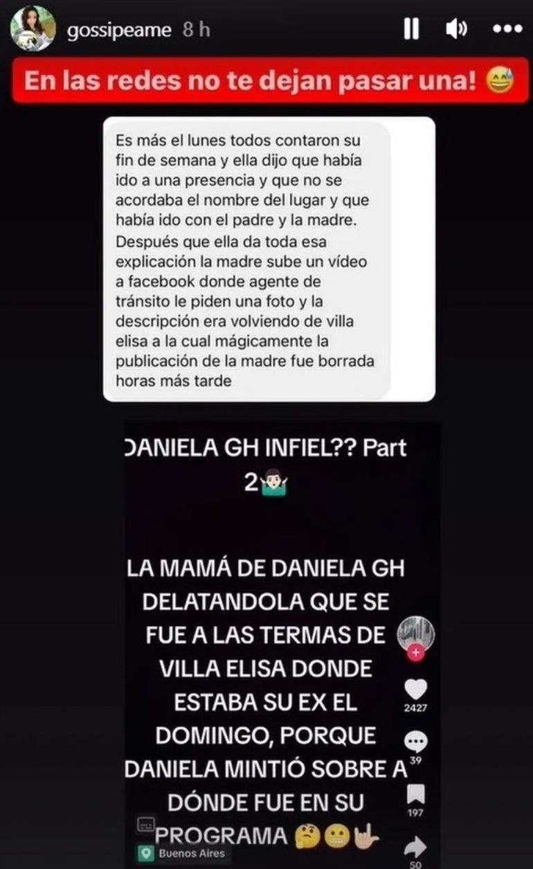 "Me mandan esto de TikTok que habla de una posible infidelidad de Daniela con su ex, hará unas semanas atrás", explicó la comunicadora, video de un viaje de fin de semana que la joven hizo con su padre a las Termas de Villa Elisa, donde aparentemente también se encontraba su ex pareja con el hijo en el mismo lugar.