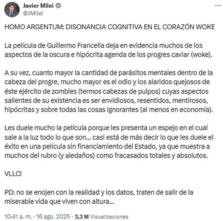 Y continuó escribiendo: "Les duele mucho la película porque les presenta un espejo en el cual sale a la luz todo lo que son... casi está de más decir lo que les duele el éxito en una película sin financiamiento del Estado, ya que muestra a muchos del rubro (y aledaños) como fracasados totales y absolutos. VLLC! PD: no se enojen con la realidad y los datos, traten de salir de la miserable vida que viven con altura...", cerró su posteo, generando un sinfín de comentarios de los usuarios y repercusión en los medios de comunicación.