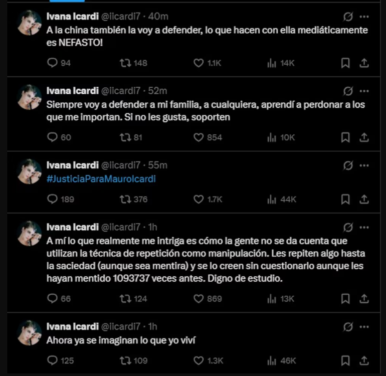 “A mí lo que realmente me intriga es cómo la gente no se da cuenta de que utiliza la técnica de repetición como manipulación”, escribió Ivana, quien también respondió a las críticas de una usuaria que le recriminó no viajar a Argentina para apoyar a su hermano.