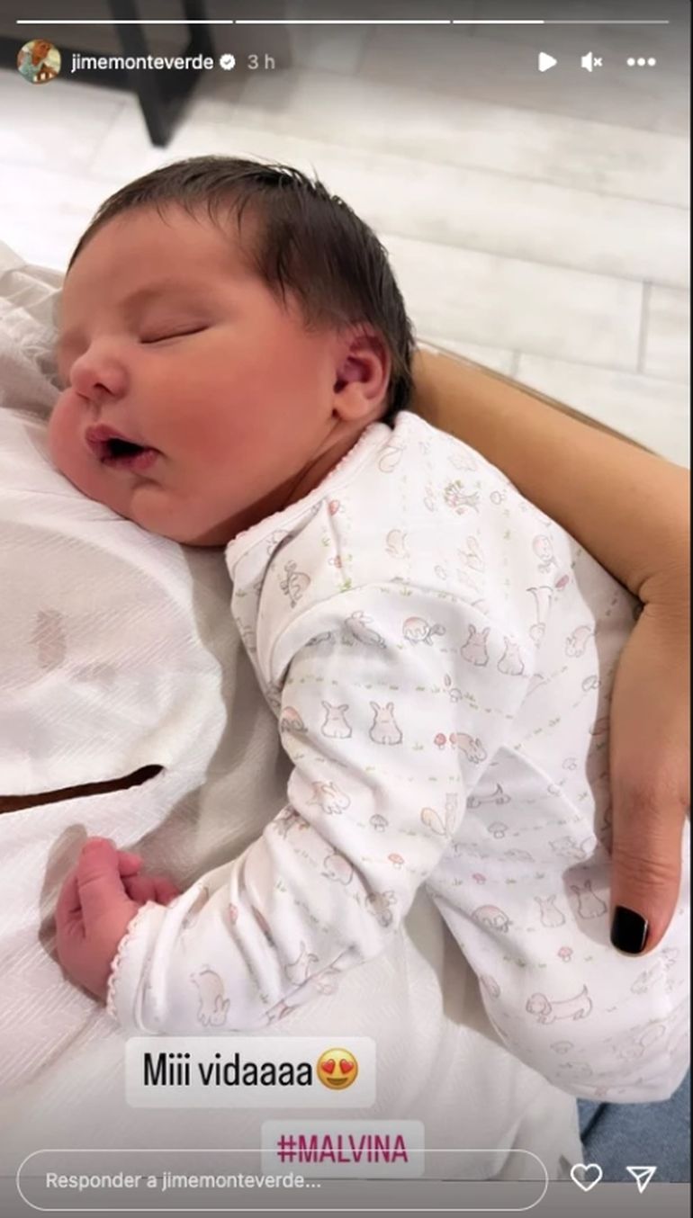 “Les presento a Malvina”, escribió en una de las storie que publicó para mostrar a la recién nacida ante las cámaras. En la foto se puede en el rostro de Jimena Monteverde una enorme sonrisa ante la llegada de la nueva integrante de la familia.