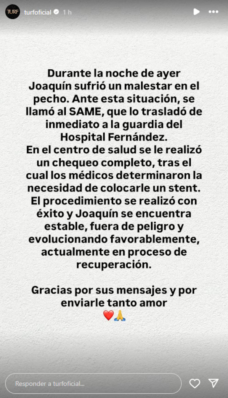 En un comunicado de prensa, las redes de la banda informaron que "Joaquín Levinton sufrió un malestar en el pecho; ante esta situación, se llamó al SAME, que lo trasladó de inmediato a la guardia del Hospital Fernández. En el centro de salud se le realizó un chequeo completo, tras el cual los médicos determinaron la necesidad de colocarle un stent".