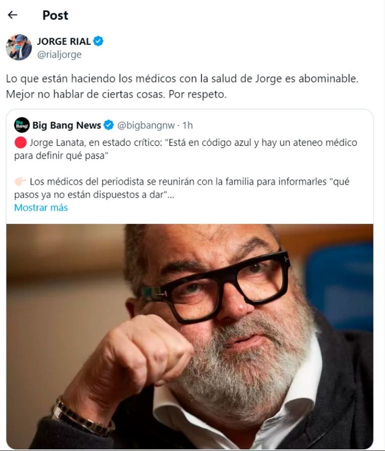 Es que Jorge Rial compartió en su cuenta de X un posteo sobre las declaraciones de Ánge de Brito sobre el estado de salud de Jorge Lanata. En esta nota, el conductor de LAM explicaba: “Hay un ateneo médico, esto es una medida bastante particular, porque la salud de Jorge sigue complicada”.