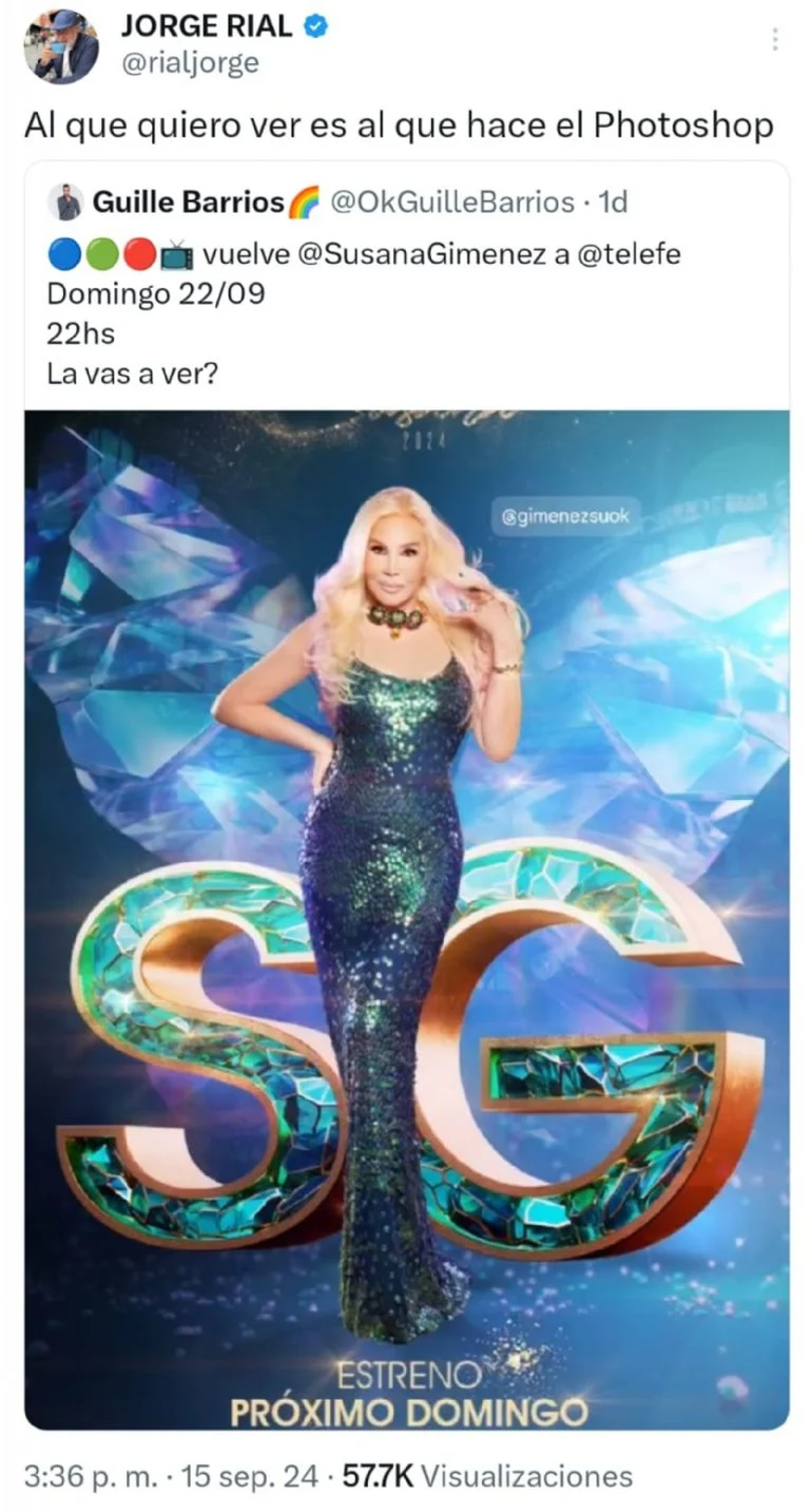 Jorge Rial reposteó la publicación del comunicador, pero no con la intención de responder esta pregunta, sino con otro fin. "Al que quiero ver es el que hace el Photoshop", lanzó el conductor de Argenzuela, haciendo referencia a la imagen de Susana Giménez.