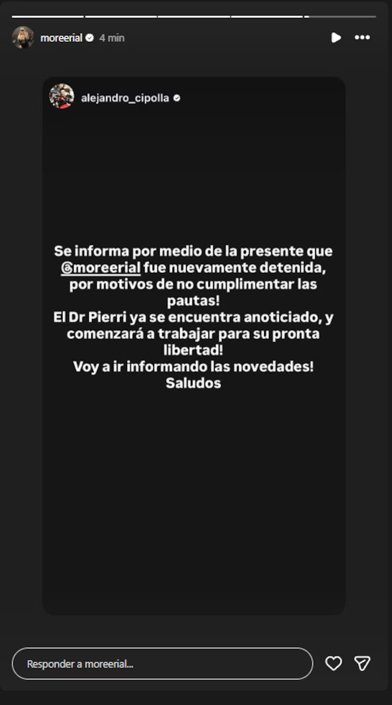 En una historia que Morena Rial compartió en su cuenta de Instagram, el letrado explicó: “Se informa por medio de la presente que @moreerial fue nuevamente detenida, por motivos de no cumplimentar las pautas”. El mensaje rápidamente se viralizó entre los seguidores de la hija de Jorge Rial, muchos de los cuales comenzaron a especular con los pasos a seguir en la causa.