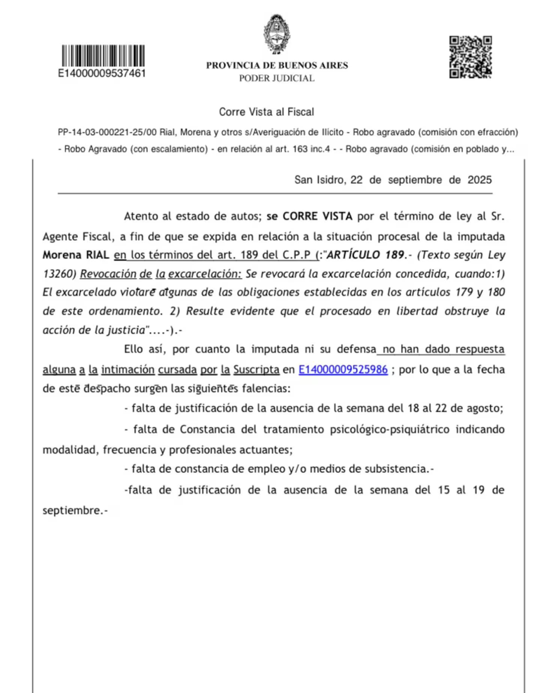 Morena Rial quedó otra vez detenida y su situación judicial se complica. La Justicia de la provincia de Buenos Aires resolvió revocar la excarcelación que había conseguido hace algunas semanas en el expediente donde está imputada por un robo bajo la modalidad de escruche. La medida fue adoptada porque la joven no cumplió con las obligaciones procesales que le habían fijado como condición para permanecer en libertad.