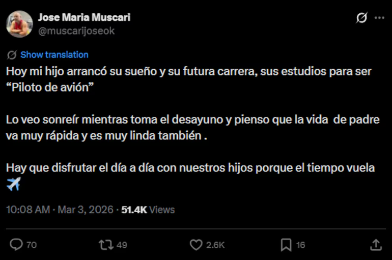 Fue a través de su cuenta de X que Muscari compartió la noticia con sus seguidores y colegas. “Hoy mi hijo arrancó su sueño y su futura carrera, sus estudios para ser piloto de avión”, escribió, dejando entrever el orgullo y la emoción que lo embargan ante el inicio de este nuevo camino. El posteo no quedó solo en el anuncio del logro de Lucio, sino que también incluyó una reflexión profunda sobre el paso del tiempo y el valor de los pequeños momentos cotidianos en la vida familiar.